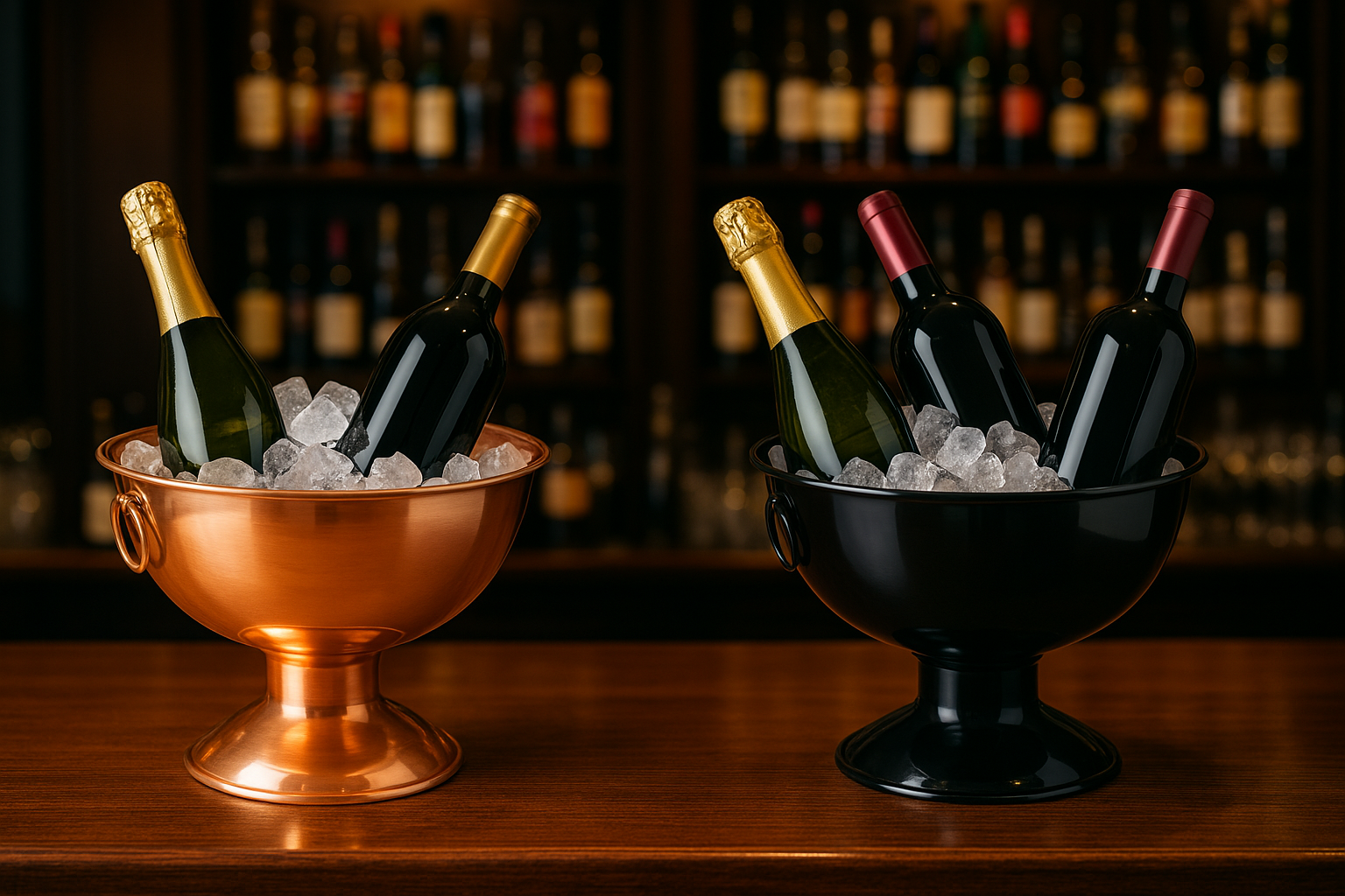 Elegância que chama atenção: Com acabamento em cobre envernizado, essa champanheira traz um toque de sofisticação e charme para qualquer ocasião – de encontros íntimos a grandes celebrações.